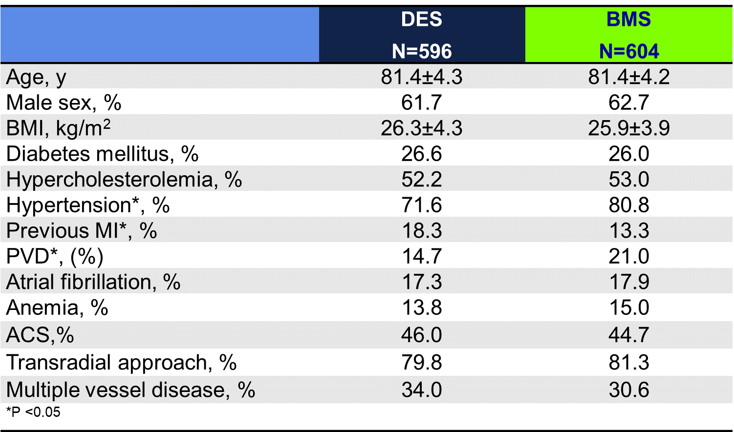 75歳以上のPCIが施行された患者において,短期DAPT下でDES使用はBMSの使用よりMACCEが有意に低かった。これは主にTLRの低下(DES 1.7% vs. BMS 5.9%)によった。なお内訳は、全死亡 (6% vs. 8%),MI (4% vs. 4%),Stroke (2% vs. 1%)。