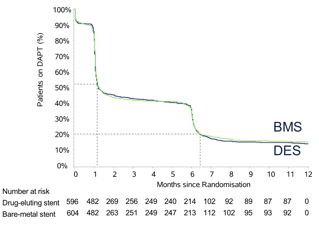 MIに関してですが、短期DAPTではDAPT study(3)にあるようにPCI後の自然発生MIが上昇するリスクも懸念されますが、本試験ではDESとBMSの間で差はありませんでした。