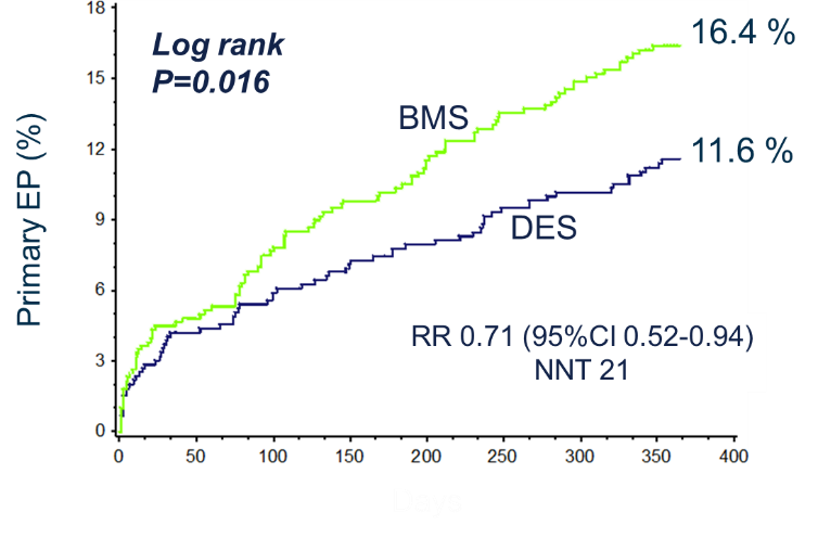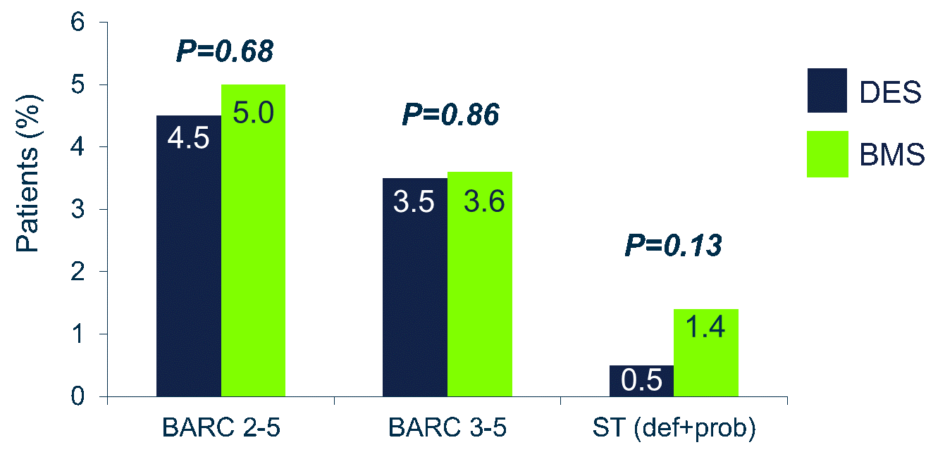 安全性評価として出血合併症,ステント血栓症(ST)は同等で、MACCEに加えてBARC 2-5までの出血合併症の発生率も加味したNet clinical benefitではDES 14.4% vs. BMS 19.2%でDES治療が有意(RR 0.75, p=0.03)に優れていた。