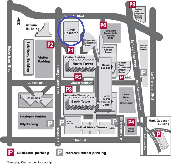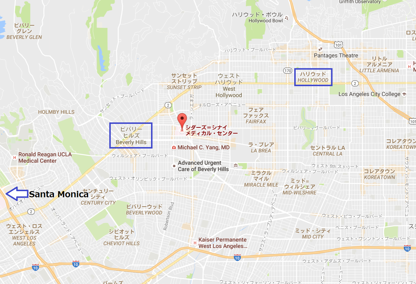 場所はアメリカ、カリフォルニア州ロサンゼルスの一等地という非常に良いロケーションです。下のマップでも分かる通り、Cedars-Sinai Medical Centerはビバリーヒルズとハリウッドの間にあります。さらに西に行くとこれぞまさに西海岸というべきサンタモニカをはじめとしたビーチの数々が見えてきます。なんだかこれらの名前を聞くだけでワクワクします、ね、重城先生。