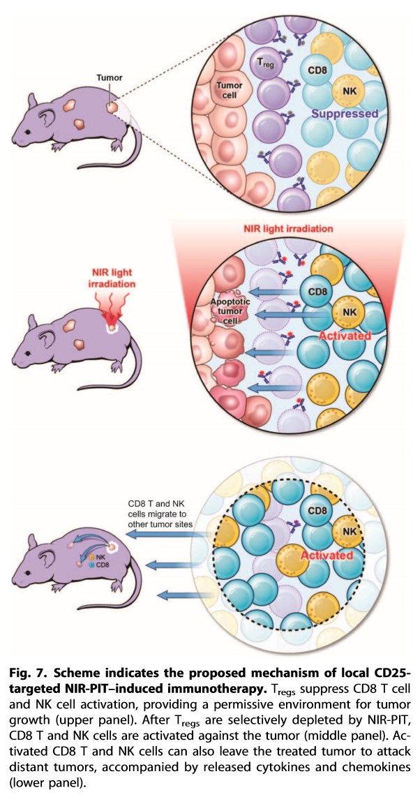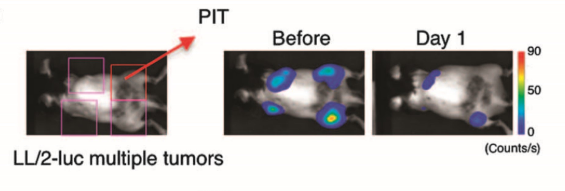 この研究ではさらに近赤外線照射部位以外の場所でも腫瘍縮小効果を認めており、活性化した免疫応答により転移性悪性腫瘍などの離れた臓器の腫瘍に対しても効果を発揮することが示されました。