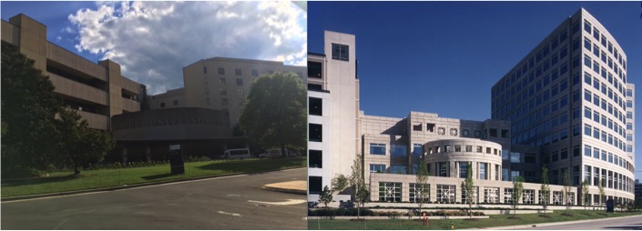 写真:Duke University Hospital(左)とDCRI(右)。歩いて5分くらいです。