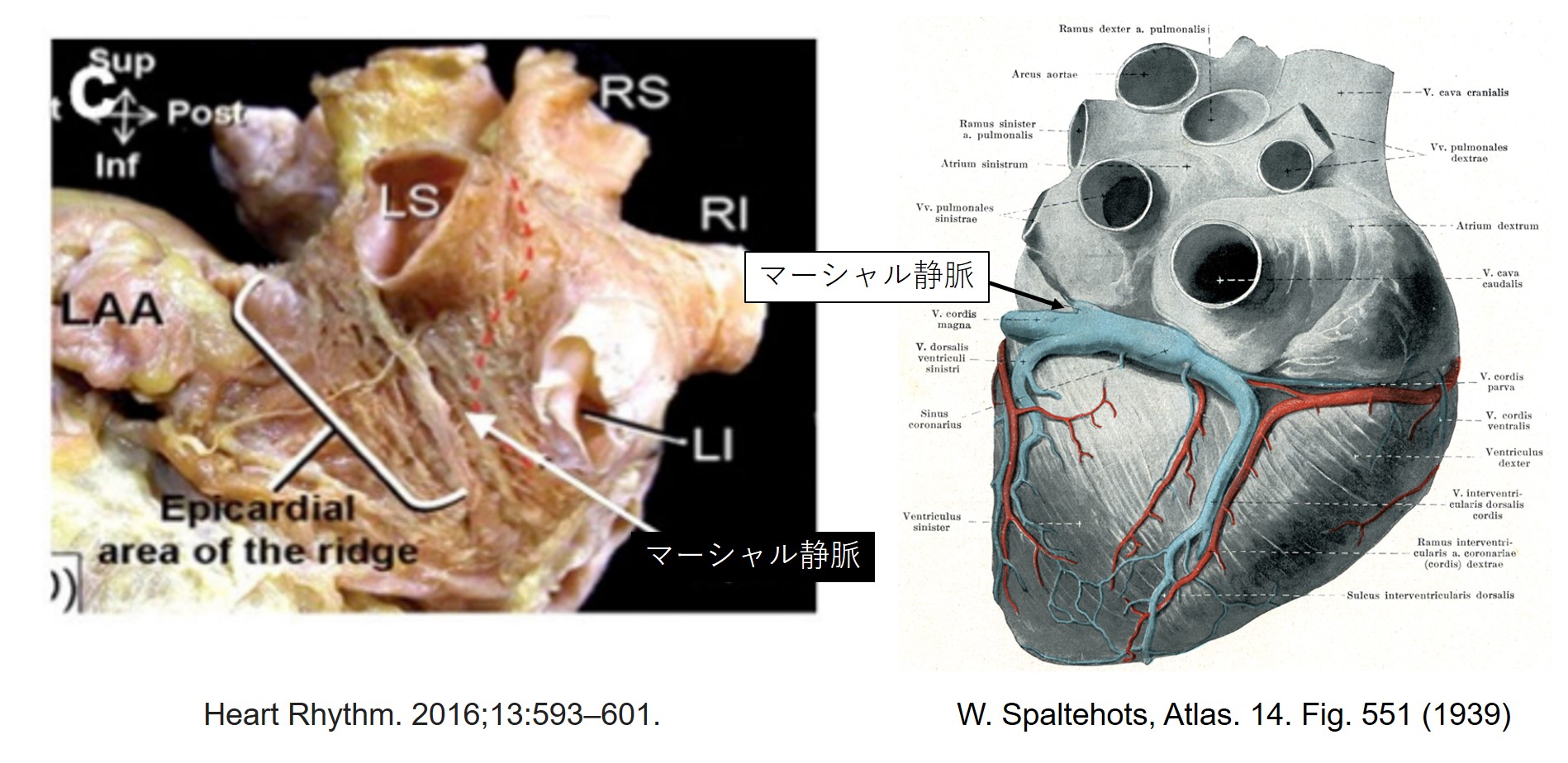 マーシャル静脈は、冠静脈洞から分枝して、左房後壁から左肺静脈に向かって走行します。RS: 右上肺静脈、RI: 右下肺静脈、LS: 左上肺静脈、LI: 左下肺静脈、LAA: 左心耳