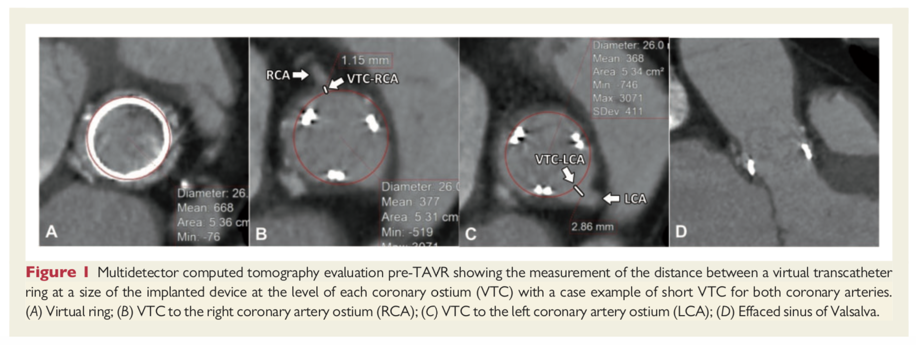上記の通り、ViV-TAVRにおいて、CT解析はTAVI弁のサイズ決定という点ではあまり重要ではありません。ViV-TAVRにおけるCT解析の肝は、coronaryとの位置関係になります。通常外科弁はcoronary ostiumからcommissural post部分を離して留置されていますが、稀にそうでない症例があり、その場合には以前のreportで紹介したBASILICA [11]はできませんし、TAVI後にcoronaryへのaccessが必要になってしまった場合はstent postが邪魔をして非常に難しくなる可能性があります。また外科弁の軸にも注意が必要で、どちらかのcoronary ostiumに軸が向かっている場合、TAVI弁を留置することにより外科弁の構造物がcoronaryに寄っていく可能性があります。またshallow valsalvaの場合はSTJ閉塞のリスクにも注意が必要になるため、Valsalva、STJの大きさも必ず計測し、Virtual valveも用いてSTJ閉塞のrisk評価も行います。Coronary heightも当然確認しますが、それ以上に重要なのがvirtual valve to coronary ostium distance (VTC)と言われるもので、ViV-TAVRの場合には必ずVTCも計測して(図3) [12]、これが4 mm以下だった場合はにより注意深く評価し、chimney stent [13]やBASILICAの可能性、そもそもRedo-AVRにもっていく可能性を考慮していきます。