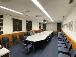 業務としては朝8時から弁膜症の治療が開始されます。8時きっかりから始めたいからなのか、患者は7時30分から45分ぐらいにはカテ室に入室しています。ハートセンター全体としては同時刻の朝8時から病棟の全体カンファレンスが始まります。カンファ室に教授、上級医、病棟医が集合します。写真にも載せているカンファ室のテーブルに教授が一人で座り、カンファ室の壁際に置かれている椅子に他の医師たちが並んで座ります。教授の威厳が最も感じられるシーンの一つです。また、カンファレンスの最後には毎日抄読会を行っています。病棟医などが最新の論文や改訂されたガイドラインに関して発表して、それに対して議論が交わされます。その他には、週に1回の心臓外科との弁膜症の合同カンファレンスも行われています。