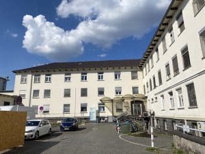 西ドイツの旧首都であったこともあり、軍の病院として終戦後すぐに建設された病院であったそうです。そのため、外見上は歴史を感じる造りの病棟が多いです。ハートセンターもその一つです。一方で、最近建て直された病棟は近代的なデザインが多く、様々な外見の建物が敷地内に混在しています。現在、ハートセンターは新しい病棟を建設中で、2−3年後に完成する予定のようです。