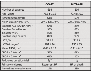 上述のような二次性MRに対する薬物治療のエビデンスを元に組まれたMitraClipのRCTがCOAPT trialです(1)。RCTの対象患者をコアラボで薬物治療が十分かどうかを含めてスクリーニングし、試験への組み入れの判断を行っています。また、治療後も薬物治療を強化していくというプロトコールになっていました。一方で、そういったプロトコールがなかったのがMITRA-FR trialで、COAPT trialと対照的にMitraClipの優位性を示せなかったRCTです(10)。この2つのRCTの異なる結果の原因を様々な側面から説明が試みられており、薬物治療の内容もその一つの可能性として挙げられています(11)。しかし、これに関しては議論が別れています。上記のようなプロトコールを持っていたCOAPT trialですが、ベースラインの薬物治療の内容はMITRA-FR trialと同程度という結果でした。