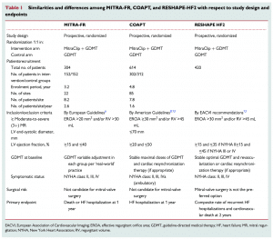 患者スクリーニングの厳密さや患者数、primary outcomeなどに加え、患者選択が異なります。COAPT trialではMITRA-FR trialよりもLVEFが高めの患者群で、かつ高度の左室拡大が除外されています。さらにMRの重症度もCOAPT trialでより高度に設定されていたことは注目されるべき点です。