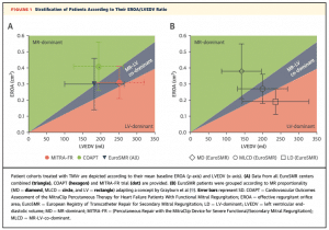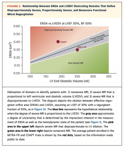 つまり、EROAが大きくてもそれ以上にLVEDVが大きければsevere MRとは言えない、ということで、それに基づいて提唱されたのがProportionate/Disproportionate MRという概念になります。2012年と2014年にそれぞれヨーロッパおよび米国のガイドラインにおいてsevere functional MRのEROAのカットオフが0.4 cm2 から0.2 cm2に引き下げられたのを受けて、MITRA-FR trial ではinclusion criteriaでEROA 0.2 cm2以上と設定されました。また、LVEFも低め(15-40%)に設定されたため、Proportionate/Disproportionate MRの考え方でいくと、non-severe MR (i.e. Proportionate MR)寄りになってしまいます。一方で、COAPT trialではEROA≧0.3 cm2とし、またLVEFも比較的高め(20-50%)、かつ高度の左室拡大の症例(LVDD≧70 mm)を除外したことにより、患者群はしっかりとsevere MR(i.e. Disproportionate MR)に相当しています。上記のような違いがあり、MRの治療の恩恵をCOAPT の患者群が最も受けやすかったのではないかと考えられています。