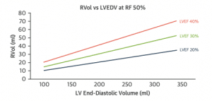 基本概念として、severe MRというのは”全心拍出の50%以上が左心房に逆流する状態“というのがコンセンサスとなっています(5, 6)。それに基づいて、定量評価であるEROA, Vena contractaなどのカットオフが定められています。そのように定義されているため、心拍出量によってsevere MRと診断されるために必要な逆流量が変わってくるということになります。したがって、左室拡張末期容積(LVEDV)と左室駆出率(LVEF)によって、severe MRと診断されるために必要な逆流量(i.e. EROA)が変化することになります。