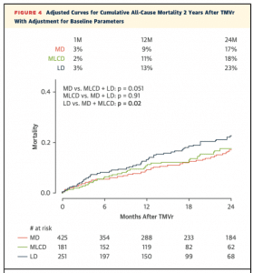 いずれの3群でもMitraClipにより十分なMR減少が得られており、NYHAの改善、6分間歩行距離の延長が得られました。しかし、有意差のあった患者背景で補正しても、LD群は他の2群と比較して、2年間の生存率は有意に低いという結果でした。