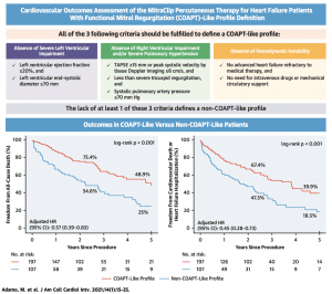 MitraClipを施行した304名のLVEF低下(≦50%)を伴う二次性MRの患者において、2年および5年での全死亡、心血管死亡+心不全入院の発症率を調べています。患者は下図のCOAPT criteria (高度の左室拡大・収縮能低下、右心機能低下・高度の肺高血圧、不安定な血行動態)にしたがってCOAPT-like もしくはNon-COAPT-likeの2群に分けられています。結果、COAPT criteriaをすべて満たすCOAPT-likeの患者群はNon-COAPT-likeの患者群と比較して、患者背景で補正した上でも良好な予後を認めました。