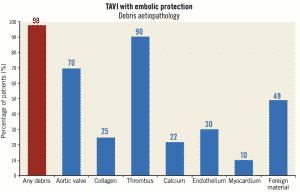 少し脱線して別の論文になりますが、こうしたSentinel で捕捉されたデブリの病理学的検討をされています(11)。やはり大動脈弁組織や血栓が多いですが、心筋組織なども塞栓となりうるようです。TAVI弁の種類によってこうしたデブリの成分も異なっていて、面白い結果です。