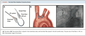 そのため、塞栓症の予防にはプラスアルファの手技が必要ではないかということで、生まれたのが保護デバイスです。TAVI施行時に飛散する大動脈弁や大動脈壁のデブリや血栓をトラップして塞栓症の発症を予防するというコンセプトです。その中で、Sentinel EPD (Boston Scientific)が欧州および米国での承認を得ていて、臨床での使用が可能となっています。図のように、2つのフィルターがついているカテーテルデバイスとなっていて、右撓骨動脈から進めて左総頸動脈と右腕頭動脈を保護するというものです。