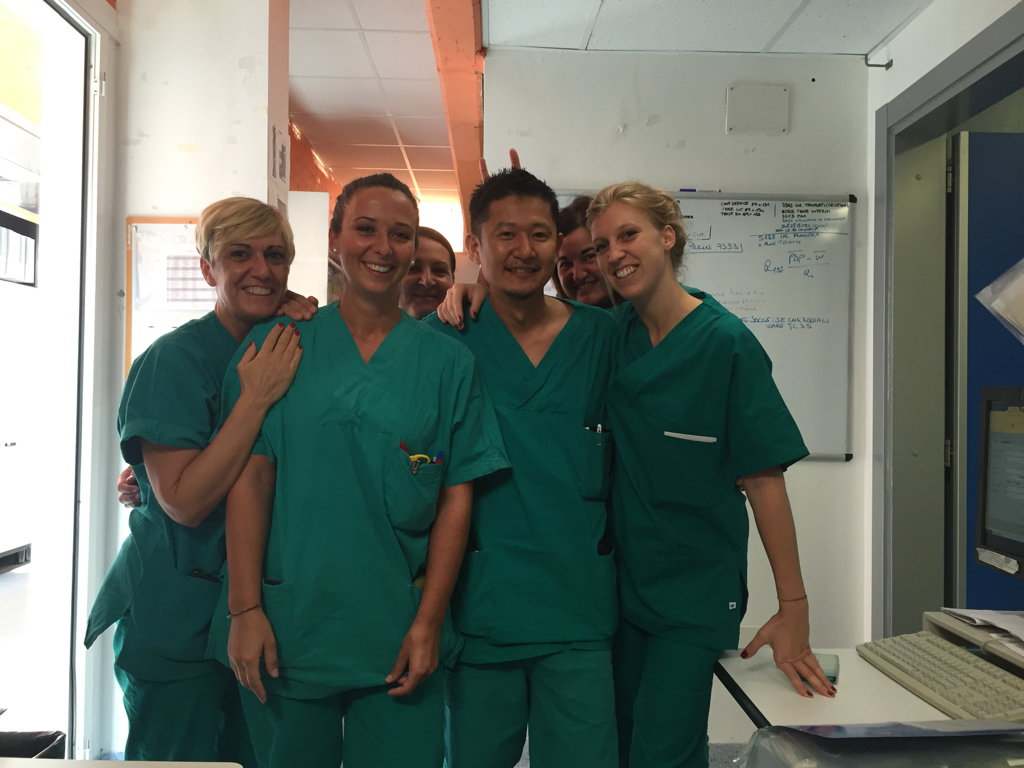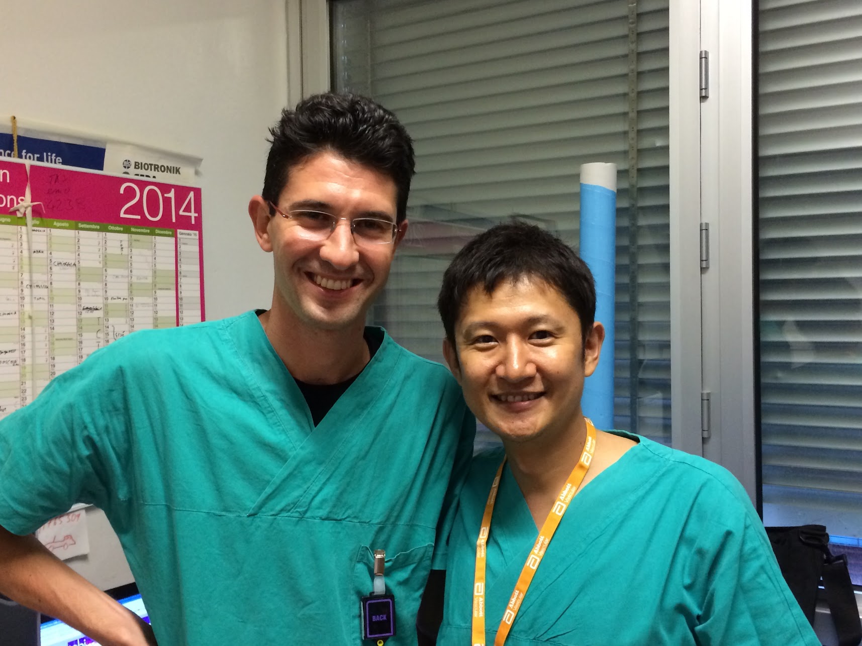 Interventional cardiology部門の医師はスッタフが5人,私を含めてフェローが3人いる.カテーテル室は全部で3室あるが,ひとつはアブレーション治療専用室となっており,基本的に2室でインターベンション治療を行なっている.1日の平均カテ件数は15件ほどだが,20件を超えることもある.コメディカルの体制は,看護師が10名程度,放射線技師が2名専属となっている.一つの症例に対して,医師1人,看護師2人(場合によっては,1人は放射線技師)で担当する.診断造影だけの場合には医師1人で全ての手技を行なっているが,カテーテル治療となった場合には,看護師が助手として手洗いして治療に参加する.カテーテル治療に関して非常に教育されており,日本で考えると後期研修医以上の知識と経験を有していて,的確に医師の補佐を行なっている.時には治療方針についてもコメントを行う.コメディカルスタッフは2交代制となっており,7:00~14:00,12:00~19:00という勤務時間である.非常に興味深かったのは,19:00を過ぎると予定していた症例を,いとも簡単に翌日に変更してしまうことだった.日本では予定したカテーテルは遅い時間になってもその日のうちに行うことがほとんどであり,このあたりは,なんともイタリアらしいなと感じた.