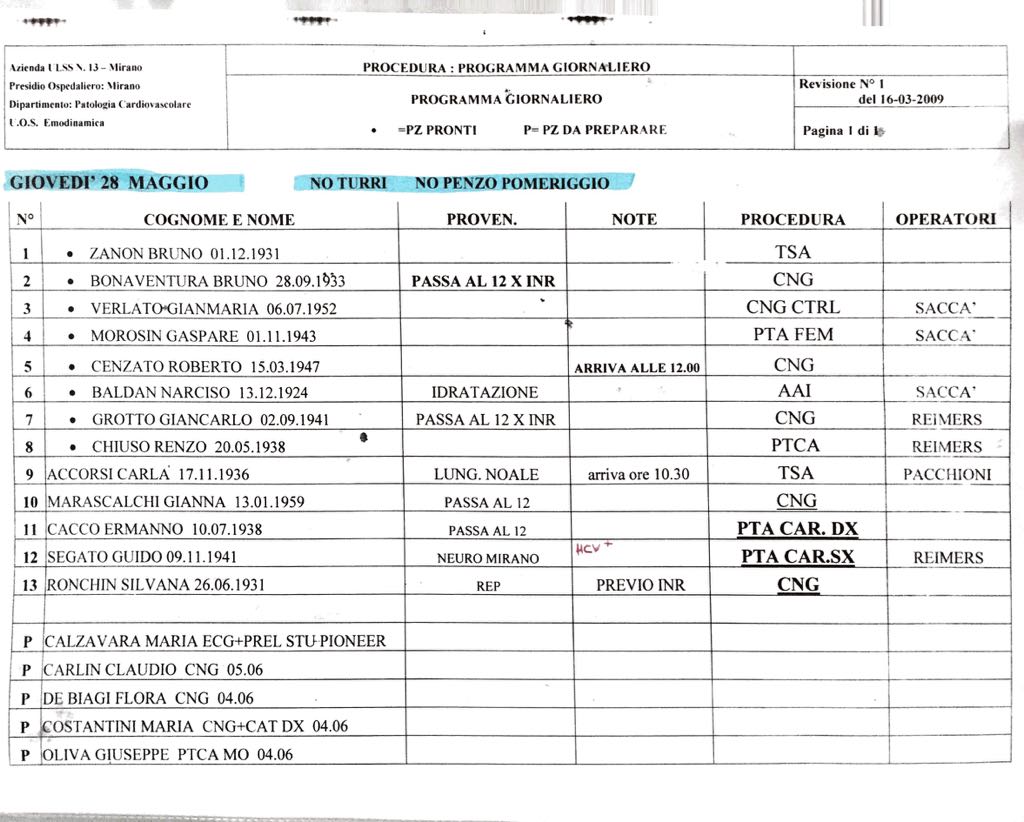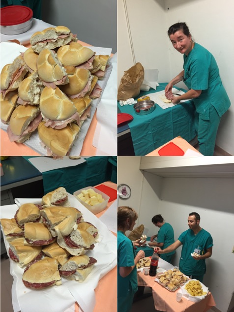 1日の始まりは意外と早い.8時頃から(早い日は7時半頃から)カテーテル検査・治療が始まるので,それまでに出勤している.基本的には,カテーテル室に朝から晩まで待機している.早朝にその日の症例一覧が貼りだされているので,まずそれを確認して,その日の予定をイメージする.留学当初は,当施設の手技に慣れるため,診断カテーテルや通常のPCIにも積極的に参加して助手をさせてもらうように務めた.助手をすることで,各オペレーターの癖や好みが分かるようになり,その後の仕事に非常に役にたった.また看護師とのやり取りが必要になるが,これについても助手をする時間が長いと,自然と会話する時間も増え,良好な人間関係を築くことが出来たと思う.最近は,ある程度当施設の流儀も理解できるようになり,またクリニカルフェローも数名増えたこともあって,頸動脈ステント術(CAS)や経皮的大動脈弁留置術(TAVI),腹部大動脈ステントグラフト内挿術(EVAR),左心耳閉鎖術(LAAC)などの症例の時に助手に入るようにしている.ただ,複雑なPCIやPTAの症例には助手に入るよう要請されることも多く,症例がある限り日中は手技に入っていることが多い.インターベンション用のカテーテル室が2部屋あるため,並列で手技が進行していることが多く,昼食は12-13時頃に各々取るようになっている.1,2ヶ月に1度位の頻度で,看護師さんが数種類のハムとパンを持ち寄り,パニーノを作ってくれることがある.どうやら,実家がハムやソーセージ作りをしているとのことだ.カテーテル室に勤務している人数分作るので,自家製パニーノが机いっぱいに並ぶことになる.お店で食べるものよりも美味しく,いつも心待ちにしている.パニーノフェスタが無い通常の日は,病院のバールに行き,サンドイッチやパスタを食べることが多い(2-5€程度).昼食後はまたカテーテル治療に戻る.だいたい19時頃まで症例が続く.月曜日から金曜日までが,上記のようなスケジュールである.土曜日・日曜日は完全に休みになる.当然,当施設は急患対応も行っているので,夜間や休日にも救急症例の治療は行っているが,緊急症例には基本的には呼ばれない.たまに,土・日にデータ整理などを行なっている時に救急患者が来たら手伝う程度である.スタッフがそれほど多くないためと思われるが,症例検討会やリサーチカンファレンスなどは,特に決まった曜日に行うのではなく,随時行なっている.症例の合間に突然,『何か新しい臨床研究のアイデアはないか?』と聞かれることもあるので,なかなか気が抜けない.勤務終了後には,アペリティーボに誘われることがある.アペリティーボ(Aperitivo)とは食前酒のことだが,いわゆる仕事帰りに一杯といったイメージである.同僚の話では,夕食が20-21時頃からと遅く,アペリティーボタイムはだいたい18-19時頃である.一日の仕事を終えたら,まずはバール(Bar)で軽く乾杯.ビールやプロセッコ(スパークリングワインの一種)が主流であるが,地元ヴェネト州の名物カクテル『スプリッツ(Spritz)』を飲む人も多い.日本で言うところの,「とりあえず、ビール!お疲れ様~!」といったやつに似た感覚だが,日本との違いは,そのまま長々と酔っ払うまで飲み続けないところである.チケッティ(cichetti)と呼ばれる軽いおつまみを食べながら,本当に軽く1杯だけ.ただ,飲んでいる間はひたすらおしゃべりである.次の臨床研究のアイデアを相談するような硬い話から,恋人とののろけ話まで実に多岐にわたる無駄話(?)である.小一時間ほどお酒と会話を楽しんだら,『じゃあ,また明日』とそれぞれ家路に着く.もちろん毎日アペリティーボに行くわけではないが,プライベートと仕事も一生懸命に楽しむ北イタリア人気質を感じることが出来る.