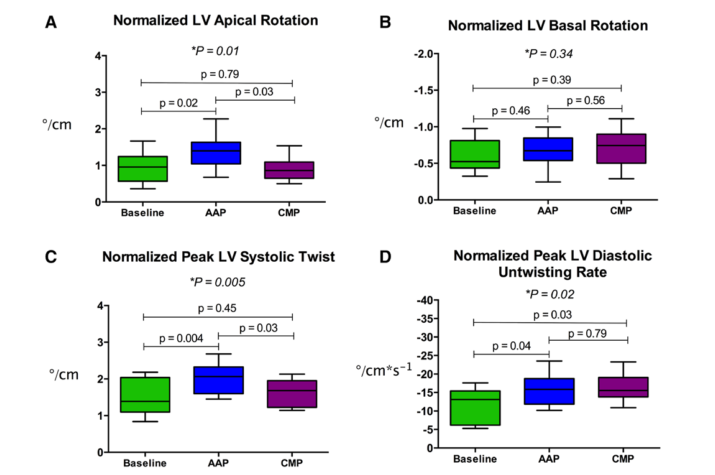 左室機能評価の項目は単にEjection fractionのみではなく、longitudinal/radial/circumferential方向のストレインや、心基部と心尖部で反対となる心筋の回転(rotation)・ねじれ(twist, torsion)も左室機能評価としてそれぞれ意味をもつ。Weinerらは運動開始後90日(acute augmentation phase; AAP)と39か月後(chronic maintenance phase; CMP)における12名のボート選手(年齢 18.6±0.5 years)のトレーニングによる左室の回転(rotation)を心エコーで調べた。結果、心尖部の回転はAAPに一過性に大きくなるがCMPに元に戻り、心基部の回転はいずれの時期でも有意差をみとめなかった。左室収縮期の全体としてのねじれ(twist)は心尖部の回転を反映して一過性にAAPで大きくなった。拡張期にねじれが戻るスピード(LV diastolic untwisting rate)はAAPでスピードが上がりCMPではそのスピードが維持された(下図2)。心筋の回転・ねじれが運動負荷による心筋リモデリングを反映したパラメーターであることがわかる。[11]