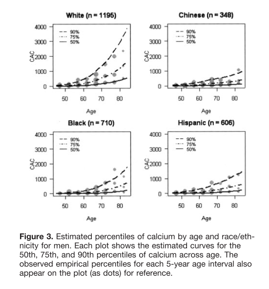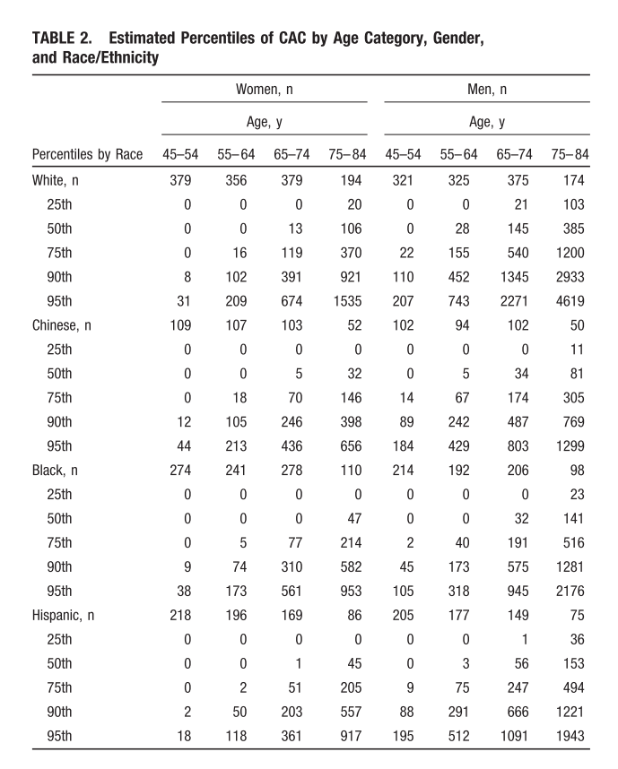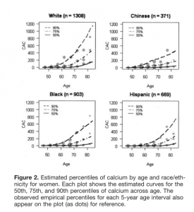 以上がこの観察研究論文の主旨であるが、石灰化スコアの人種・性別・年齢における分布の違いが印象的である。他論文を読む際にも、石灰化スコアがMESA studyにおけるどの群にあたるのかを注意しながら読むと、より良い解釈ができると思われる。