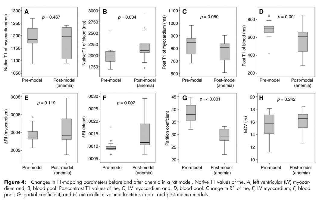 T1 mapのパラメーターのひとつであるExtracellular Volume (ECV)が貧血により影響をうけるか、動物モデルで検証した論文です[1]。