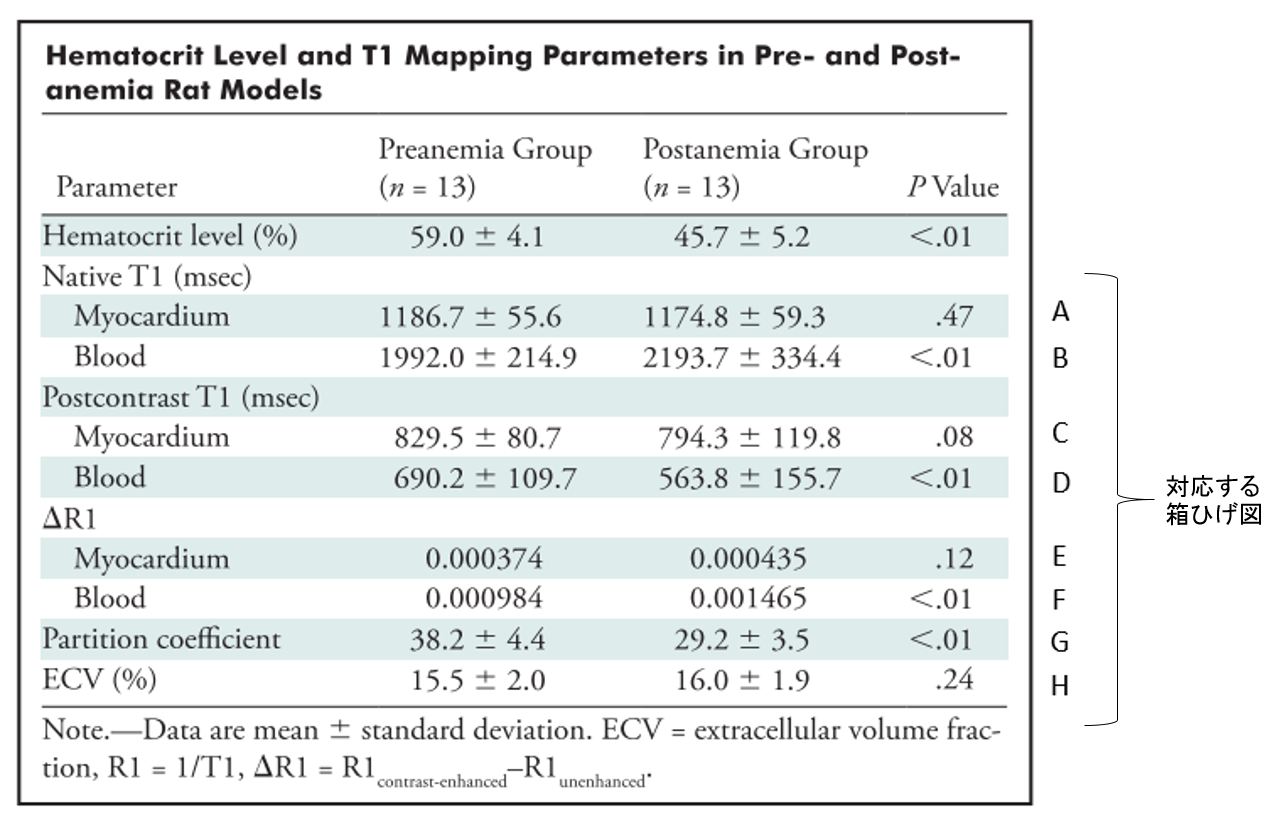 MRIの結果は以下の表にまとめられ、対応する箱ひげ図も表示されています。貧血処置後に有意差を示したものとしてはヘマトクリット値の減少、Blood poolにおける造影前T1値(Native T1)値の上昇と造影後T1値の低下、それに伴うBlood poolの⊿R1の増加、Partition coefficients (PC)の有意な減少を認めています。しかし、ECVは貧血による有意な変化は認められませんでした(前出のECVを求める計算式を見ると、PCとヘマトクリット値の変化が相殺されたような形になっています)。