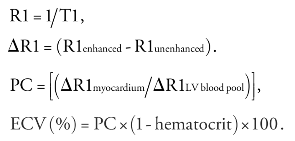 各パラメーターについて: T1 mappingの撮影からInversion pulseを入れた後の組織のT1値の時間経過による変化をグラフ化することができます。このT1値のグラフが63%回復するまでの時間がT1緩和時間(=“T1値”とも言います)です。T1値の逆数をR1とします。造影剤によりT1緩和時間は短縮しますので、造影後のR1は造影前のR1よりも大きくなります。この造影前後のR1の差を⊿R1と書きます。Partition coefficients (PC)は、心筋における⊿R1を左室内腔のBlood poolの⊿R1で除したものになります。ECVは得られたPCに (1-ヘマトクリット値) と100を乗じて求めます(単位は%)。(Report 3参照)