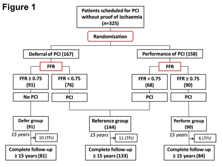DEFER試験とは安定狭心症患者において冠動脈造影で有意狭窄が認められた場合に、FFRを用いて心筋虚血評価を実施し、FFRで虚血陽性(FFR < 0.75)でPCIを実施したReference群、FFRで虚血陰性(FFR ≥ 0.75)でもPCIを実施したPerform群、FFRで虚血陰性(FFR≥ 0.75)でPCIを回避したDefer群の3群の予後を比較した試験である(Figure 1)。