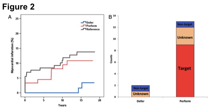 DEFER試験は、本来2年次の心血管イベントをprimary endpointに設定した試験であるが臨床的に注目度が高いため15年の超長期フォローアップを実施したとのことである。それにも関わらず今回の報告では92%と大多数の患者がフォローアップされている。15年の結果では、死亡、再血行再建に関しては3群間で差は認められなかったが、心筋梗塞がDefer群に比較してReference群、Perform群で多く認められたと報告している。さらにその心筋梗塞の発生はFFR測定もしくはPCIを実施したtarget vessel由来のものがほとんどであった(Table)。この結果から、FFRで虚血陰性の場合にPCIを回避することの正当性が超長期間においても保証されることが示され、付け加えてPCIを実施することでむしろ心筋梗塞を増加させる危険性も示された。