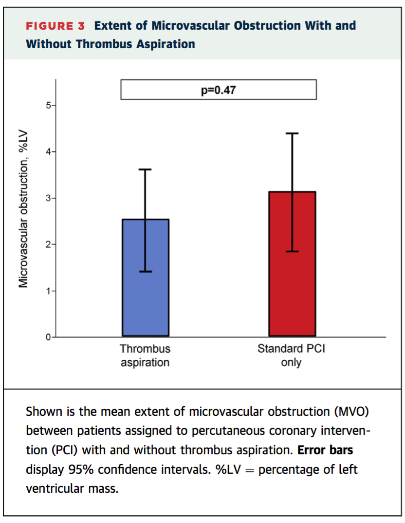 発症から12時間以上48時間以内の時間以内の152人のSTEMI患者を、血栓吸引ありなしの1:1にランダマイズし1-4日後のMRIでのMicrovascular obstructionの程度をPrimary endpointとして評価しています。発症からPCIまでの平均時間は28±12時間でした。Primary endpointであるMicrovascular obstructionはコントロール群 (74人) 3.1±4.4%に対し血栓吸引群(70人) 2.5±4.0% (p = 0.47)と差は認められませんでした。またinfarct size, myocardial salvage, left ventricular ejection fraction, and angiographic and clinical endpointsのいずれにおいても差は認められませんでした。