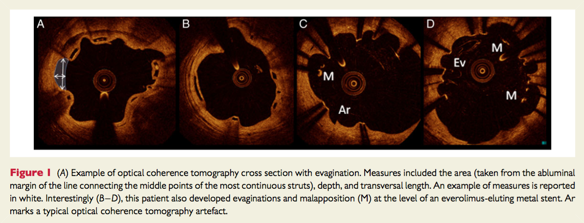 “Evaginations were defined as bulges in the luminal contour between struts with a maximum depth (white double-headed arrow) exceeding the actual strut thickness.”