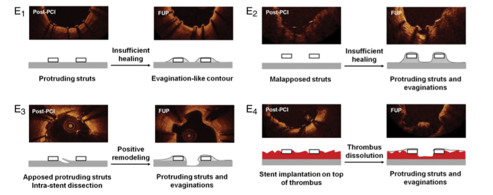 言い換えますと、炎症反応によりPositive remodelingが起こってEvaginationができているのか(異常反応)、単にNeointimal coverageのひとつの過程で、Backside connecting bridgeができているのか(正常反応)が全く区別できません。後者の場合、さらにフォローアップ期間を延ばせばEvaginationは全て消えている可能性が十分にあります。そのため、ベースラインのOCT画像がなければ何も語れないはずです。Editorialの中でも、この点については明確に指摘していませんが、メカニズムを説明するFigureで、後者のメカニズムを示した画像の中でEvagination-likeと表現しています (Figure E2)。(8)