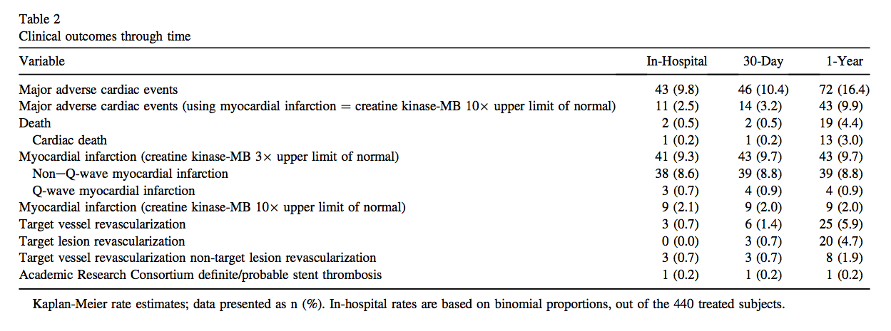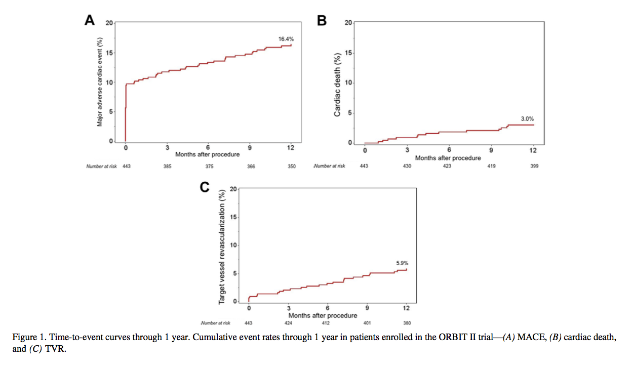 ORBIT II trialはアメリカの49施設で行われたprospective, multicenter, nonblinded clinical trial です。Primary safety endpointは術後30日までのMACE、Primary efficacy endpointはProcedural successでした。この結果はJACC interventionに2014年に発表されていましたが(2)、今回の論文は術後1年での臨床結果です。